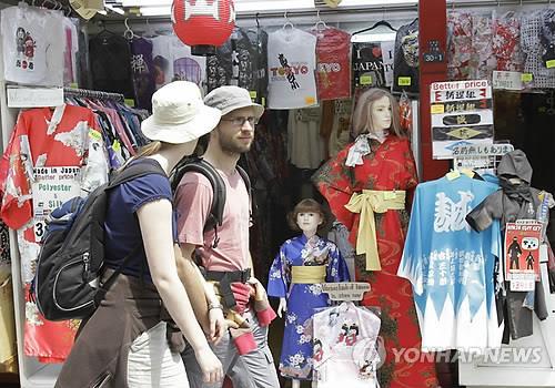 △ 일본 도쿄 아사쿠사의 상점가를 지나가는 외국인 관광객(AP.연합뉴스.자료사진)