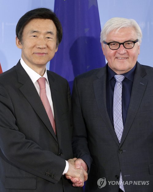 | △ 한국·독일 외교장관 회담 (베를린 AP=연합뉴스) 윤병세 외교장관과 프랑크-발터 슈타인마이어 독일 외교장관이 12일(현지시각) 베를린 외교부 청사에서 회담을 앞두고 악수하고 있다. ciy@yna.co.kr |