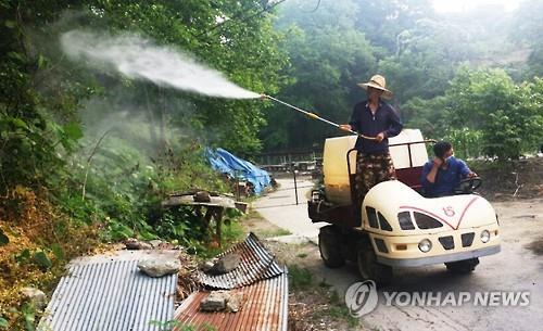 | △ 중동호흡기증후군(메르스) 확산을 막기 위해 마을주변 소독하는 주민들. |