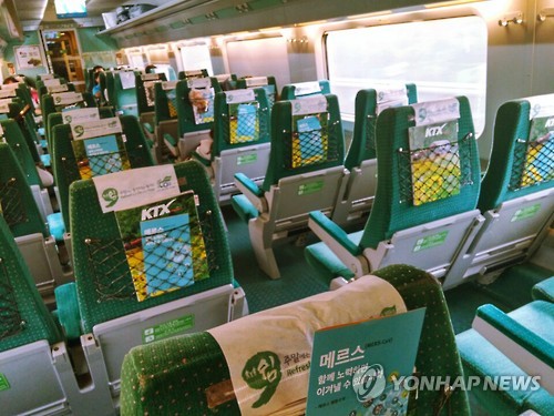 | △ 메르스 여파…텅빈 KTX 객실 (대구=연합뉴스) 이재혁 기자 = 메르스 여파로 주말인 13일 오후 5시 20분 서울역을 출발한 부산행 KTX가 객실이 텅 빈 채 김천을 지나 동대구역을 향해 달리고 있다. 2015.6.13 yij@yna.co.kr |