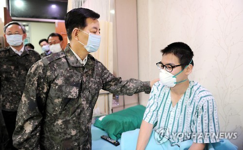 | △ 국방부장관, 메르스 대비태세 현장 순시 (서울=연합뉴스) 한민구 국방부장관이 14일 오후 오산공군기지내 격리병동을 찾아 병사들을 격려하고 있다. 한 장관은 “한 발 빠르고 과감한 대응만이 메르스의 군내 확산을 차단할 수 있다면서, 현재 안정적으로 상황관리가 되고 있는 만큼 과도한 불안감은 오히려 메르스 극복에 장애가 될 수 있다”고 밝혔다. 2015.6.14 << 국방부 제공 >> photo@yna.co.kr |