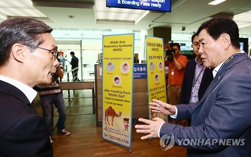 | △ 공항 출국심사 설명 듣는 최경환 총리 대행 (영종도=연합뉴스) 홍해인 기자 = 최경환 국무총리 대행 겸 기획재정부장관이 14일 오후 인천국제공항 출국심사대 앞에서 중동호흡기증후군(메르스) 관련 공항 검역 상황에 대한 설명을 듣고 있다. 2015.6.14 hihong@yna.co.kr |