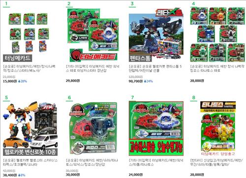 G마켓이 이달 12일 기준으로 국내 완구 베스트셀러를 꼽아보니 1∼2위, 4위, 6∼8위가 모두 터닝메카드 관련 상품이었다.