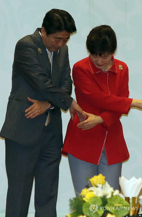 | △ 박근혜 대통령과 아베 신조 일본 총리가 2014년 11월 13일 오후 미얀마 국제회의센터(MICC)에서 열린 ‘아세안(ASEAN)+3 정상회의’ 기념촬영에서 손을 맞잡고 있다. (연합뉴스 자료사진) |