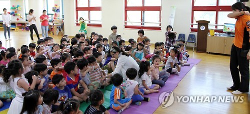 | △ 소방서 관계자들이 서울의 한 유치원에서 원생 및 교사를 대상으로 메르스 감염방지를 위한 올바른 기침범 교육을 하고 있다.(연합뉴스 자료사진) |