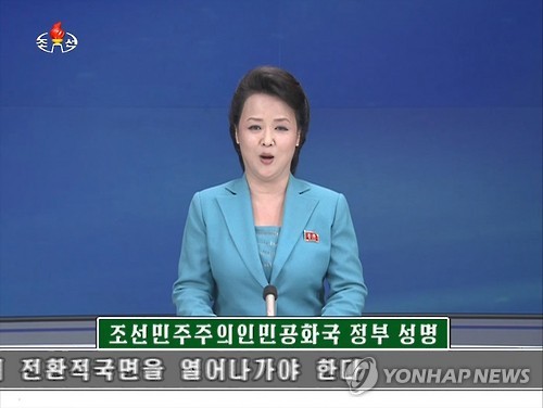 | △ 조선중앙TV 아나운서가 15일 '북한은 6·15 남북 공동선언 발표 15주년을 맞아 남북 당국간 대화와 협상에 나설 수 있다'는 입장이 담긴 '공화국 정부 성명' 을 보도하고 있다.2015.6.15. |