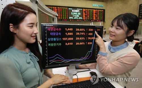 | △ 가격제한폭 확대 첫날…코스피 4개 종목 상한가 (서울=연합뉴스) 임헌정 기자 = 주식시장 가격제한폭이 ±30%로 확대된 첫 날인 15일 서울 여의도 한국거래소에서 직원들이 태양금속우, 태양금속, 삼양홀딩스, 계양전기우 등 상한가를 기록한 코스피 4개 종목의 시세변동 그래프를 살펴보고 있다. 2015.6.15 kane@yna.co.kr |