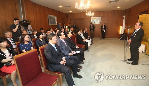 △ 욱일쌍광장 받은 이수현씨 부친 (부산=연합뉴스) 김선호 기자 = 16일 오전 11시 30분 부산 수영구 주부산일본국총영사 관저에서 의인인 고 이수현씨 아버지인 이성대 LSH 아시아장학회 명예회장이 일본 정부의 훈장인 '욱일쌍광장'을 받은 뒤 소감을 말하고 있다. 2015.6.16 wink@yna.co.kr