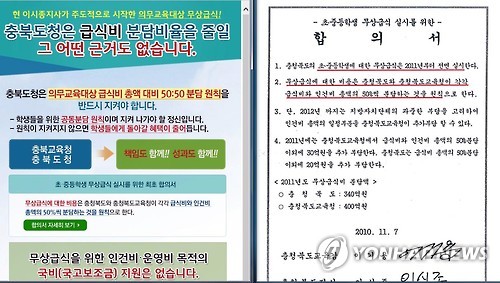 | △ 충북교육청 '무상급식 50대 50 분담원칙 합의서' 전격 공개 (청주=연합뉴스) 무상급식비 분담률을 놓고 충북도와 치열한 샅바싸움을 벌이는 충북도교육청이 홈페이지를 통해 2010년 11월 당시 이시종 지사와 이기용 교육감이 서명한 무상급식 합의서를 전격 공개했다. 사진은 무상급식과 관련해 충북도교육청의 입장(왼쪽)과 합의서(오른쪽). 2015.6.11 <<충북도교육청 인터넷 홈페이지 캡처>> vodcast@yna.co.kr |