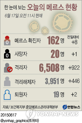 (서울=연합뉴스) 고미혜 기자 = 중동호흡기증후군(메르스) 확진자 가운데 1명이 추가로 사망해 전체 사망자가 20명으로 늘어났다.