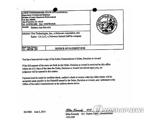 | △ 캘리포니아 노동위 '버위크 대 우버' 심결 송달 (샌프란시스코=연합뉴스) 임화섭 특파원 = 미국 샌프란시스코에 본사를 둔 유사 콜택시 업체 우버를 통해 승객을 태우는 운전자를 이 회사의 피고용인으로 봐야 한다는 미국 캘리포니아 노동위원회의 심결이 나왔다. 사진은 3일자로 작성돼 4일 우버 측에 송달된 명령서 표지. 2015.6.18 solatido@yna.co.kr |