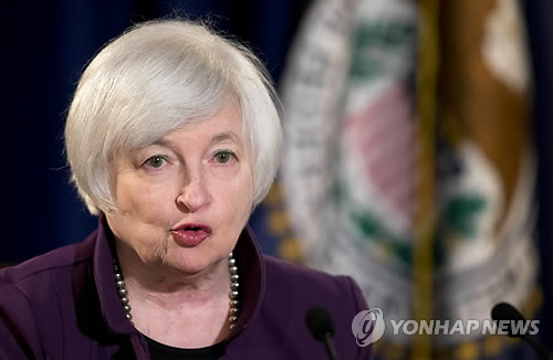 △ 미국 연준 기준금리 동결 (워싱턴 AP=연합뉴스) 재닛 옐런 미국 연방준비제도(연준) 의장이 17일(현지시각) 워싱턴에서 연방공개시장위원회(FOMC) 정례 회의가 끝난 뒤 기자회견을 하고 있다. 연준은 이날 '미국 경제가 올해 초 슬럼프 이후 강화됐으나 금리를 인상하기 전에 노동시장이 더 개선되고 인플레이션율이 더 높아지는 것을 보길 원한다'고 밝혔다. ciy@yna.co.kr
