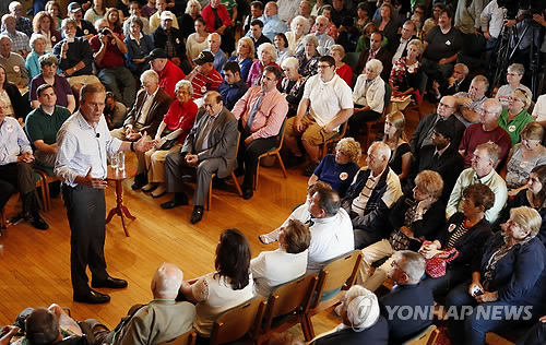 △ (데리<미 뉴햄프셔> AP=연합뉴스) 미국 공화당 대통령선거 후보인 젭 부시 전 플로리다 주지사가 16일(현지시각) 뉴햄프셔 주 데리 오페라하우스에서 유권자들에게 연설하고 있다. 미국에서는 뉴햄프셔 주에서 가장 먼저 대통령 예비선거를 치른다.
