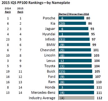 럭셔리 브랜드를 포함한 전체 브랜드 33개 중에서는 포르셰(80)가 1위, 기아차(86)가 2위를 각각 차지했다. 이어 재규어(93), 현대차(95), 인피니티(97) 등의 순이었다. 일본 자동차 중에서는 렉서스(104)가 9위에 오른 것이 최고였다.