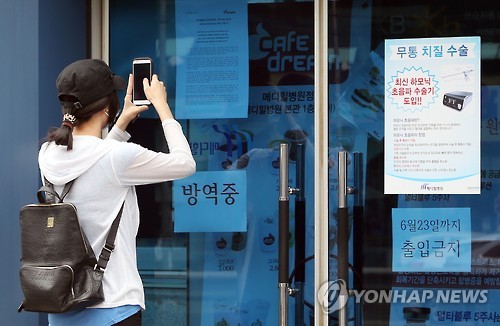| △ 병원 출입통제 안내문 촬영 (서울=연합뉴스) 홍해인 기자 = 11일 오후 서울 양천구 메디힐병원 입구에서 한 내원객이 출입통제에 대한 병원 안내문을 스마트폰으로 촬영하고 있다. 서울시는 이날 시장-구청장 연석회의를 열고 메르스에 감염된 98번 환자가 입원했던 양천구 메디힐병원에 대해 23일까지 입·퇴원을 금지하는 등 영업중단 조치했다. 98번 환자는 전염력이 가장 왕성할 때인 6월 4일부터 3일간 메디힐병원에 입원했다. 2015.6.11 hihong@yna.co.kr |