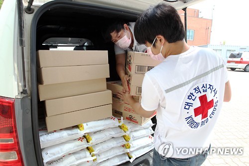 △ '메르스 자가격리자를 위해' (서울=연합뉴스) 대한적십자사 경기도지사는 17일 경기도 내 중동호흡기증후군(MERS) 자가격리자들을 위해 구호품(쌀, 라면, 부식세트)을 해당 시·군 보건소로 전달했다고 17일 전했다. 대한적십자사 관계자들이 구호물품을 운반하고 있다. 2015.6.17 << 대한적십자사 제공 >> photo@yna.co.kr