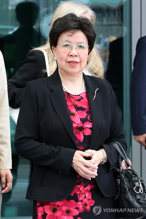 | △ 마가렛 찬 세계보건기구 사무총장 입국 (영종도=연합뉴스) 김주성 기자 = 마가렛 찬 세계보건기구(WHO) 사무총장이 18일 오전 인천공항을 통해 입국해 의전실에서 나오고 있다. 세계간호사대회 참석차 방한한 마가렛 찬 사무총장은 한국의 중동호흡기증후군(메르스) 발생에 대한 세계보건기구의 권고를 제시할 것으로 예상된다. |
