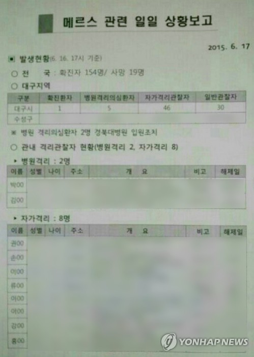 (대구=연합뉴스) 김선형 기자 = 보건소가 구의원에게 보고용으로 만든 중동호흡기증후군(메르스) 자가격리자 명단이 사회관계망서비스(SNS)에 유포돼 파문이 일고 있다.