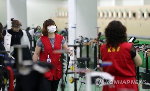 △ 사격장에도 메르스 여파 (대구=연합뉴스) 김준범 기자 = 18일 대구종합사격장에서 열린 제31회 대한사격연맹 회장기 전국사격대회 10m 공기소총 여자 대학부 경기 감독관들이 마스크를 쓰고 지켜보고 있다. 2015.6.18 psykims@yna.co.kr