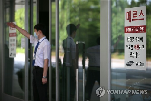 | △ 병원 출입 통제하는 보안요원 (서울=연합뉴스) 중동호흡기증후군(메르스) 확산 여파로 부분적인 병원 폐쇄조치가 내려진 서울 일원동 삼성서울병원에서 18일 오전 보안요원이 일반인의 출입을 통제하고 있다. |