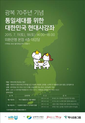 탈북청년모임 '위드유(with-U)'는 다음 달 11일과 18일 서울 중구 외환은행 대강당에서 하나금융그룹과 남북하나재단 후원으로 '광복 70주년 기념 통일세대를 위한 대한민국 현대사 강좌'를 진행한다고 19일 밝혔다.