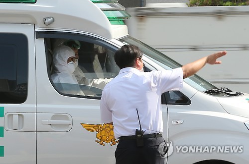 △ 지방에서 후송되는 메르스 확진환자 (서울=연합뉴스) 황광모 기자 = 18일 오후 서울 을지로 국립중앙의료원에 중동호흡기증후군(메르스) 환자가 119 구급대 구급차를 통해 이송되고 있다.