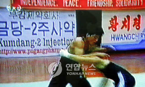 | △ 북한이 2004년 9월 평양에서 열린 제1회 국제무도대회 경기장에 내건 '금당-2주사약' 광고. 조선중앙TV 촬영/ 2004.9.16 (서울=연합뉴스) <저작권자 ⓒ 2004 연 합 뉴 스. 무단전재-재배포 금지.> |