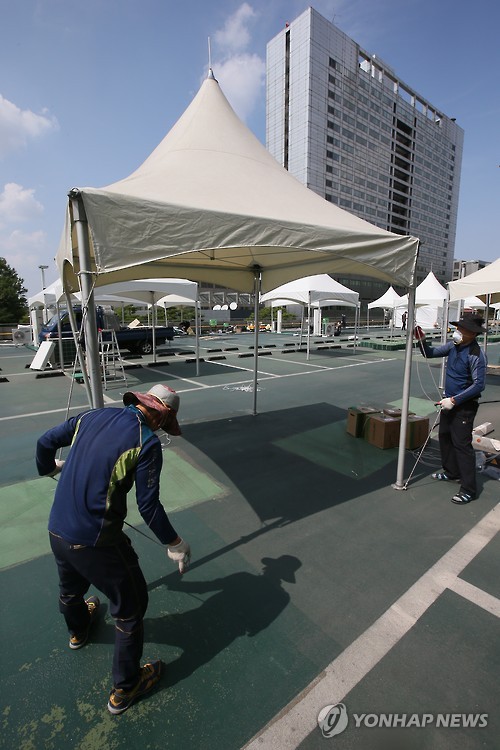 △ 삼성서울병원, 옥외 메르스 대응 시설 설치 (서울=연합뉴스) 박지호 기자 = 중동호흡기증후군(메르스) 사태가 장기화 국면에 접어든 가운데 18일 오후 서울 일원동 삼성서울병원 주차장에서 병원 관계자들이 메르스 대응 시설을 설치하고 있다. 2015.6.18 jihopark@yna.co.kr