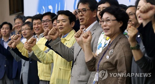 | △ 경기도 보건의료계 "메르스, 함께 이겨냅시다" (수원=연합뉴스) 신영근 기자 = 21일 오후 경기도 수원 경기도청에서 '중동호흡기증후군(메르스) 극복을 위한 경기도 보건의료계 협약식'이 열려 남경필 경기도지사(오른쪽 세번째)를 비롯 경기도 의사회·약사회·간호사회·병원회 관계자들이 메르스 극복에 총력 대응할 것을 다짐하고 있다. 2015.6.21 drops@yna.co.kr http://blog.yonhapnews.co.kr/geenang |