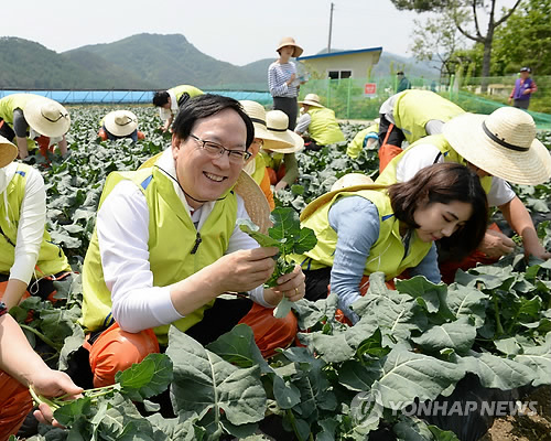 △ NH농협금융지주 김용환 회장이 지난달 14일 임직원들과 함께 강원 홍천 왕대추마을에서 영농철 일손돕기를 하고 있다.