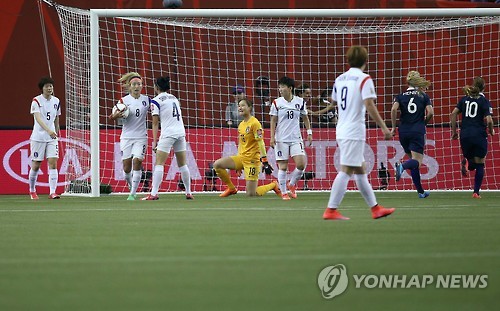 △ 무너지는 대한민국 (몬트리올=연합뉴스) 신준희 기자 = 22일 오전(한국시간) 캐나다 몬트리올 올림픽 스타디움에서 열린 2015 캐나다 여자 월드컵 16강전 한국과 프랑스의 경기. 프랑스에 세번째 골을 내준 한국 선수들이 아쉬워하고 있다. 2015.6.22 hama@yna.co.kr