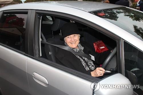 | △ (시드니=연합뉴스) 김기성 특파원 = 한국전쟁 당시 유엔군으로 참전한 남편을 잃은 호주 여성 올윈 그린(91·가운데) 여사가 21일 시드니에서 호주 참전자를 기리기 위한 행사에 참석한 뒤 자신의 차량에 앉아 미소를 짓고 있다. 2015.6.22 |