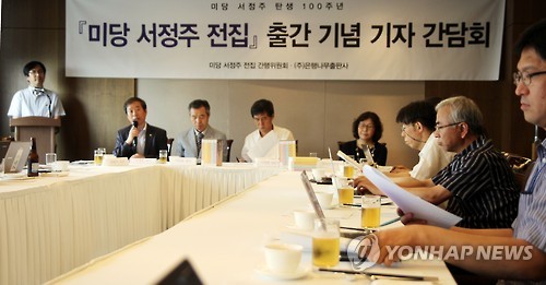 | △ 미당 서정주 탄생 100주년 기념 전집 발간 (서울=연합뉴스) 한국 대표 시인 미당 서정주(1915~2000)의 탄생 100주년을 맞아 미당의 제자와 연구자로 구성된 간행위원회가 20권 규모의 '미당 서정주 전집' 출간을 시작했다. 22일 서울 중구 프레스센터에서 열린 기자간담회에서 윤재웅 동국대 국어교육학과 교수가 이달 먼저 출간된 시 전집 1~5권을 소개하고 있다. 2015.6.22 << 은행나무 제공 >> photo@yna.co.kr |