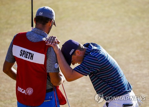 | △ US오픈 골프대회에서 경기 중인 조던 스피스(오른쪽)과 캐디 마이클 그렐러(EPA=연합뉴스) |