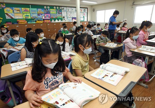 | △ 수업 재개한 초등학교 (부산=연합뉴스) 김재홍 기자 = 22일 부산시 수영구 한 초등학교에서 수업이 진행 중이다. 이 학교는 중동호흡기증후군(메르스) 탓에 휴업했다가 이날부터 수업을 재개했다. 2015.6.22 pitbull@yna.co.kr |
