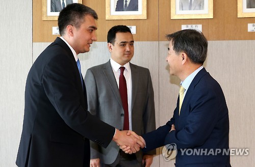 △ 아사도프 우즈베크 대사 연합뉴스 방문 (서울=연합뉴스) 이지은 기자 = 박노황(오른쪽) 연합뉴스 사장이 22일 서울 종로구 수송동 연합뉴스 본사를 방문한 보트르존 아사도프 주한 우즈베키스탄 대사와 악수하고 있다.