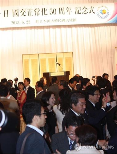 (도쿄=연합뉴스) 조준형 이세원 특파원 = 22일 도쿄 도내 호텔에서 열린 한일 국교정상화 50주년 기념 리셉션에는 일본 정계 요인들이 총출동, 한일관계 개선에 대한 일본 정가의 기대를 반영했다.