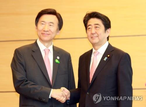 | △ 22일 총리관저를 방문해 아베 신조(오른쪽) 일본 총리와 악수하는 윤병세 외교부 장관. |
