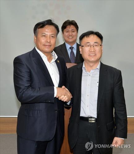 | △ (청주=연합뉴스) 심규석 기자 = 지난해 7월 원 구성 이후 4개월째 파행을 겪던 충북도의회의 새누리당 임병운(왼쪽) 원내대표와 새정치연합 이광희(오른쪽) 원내대표가 지난해 10월 16일 악수하고 있다. 이들은 당시 교섭단체를 구성하기로 합의했다. |