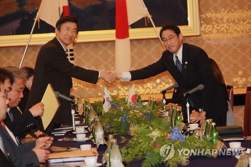 | △ 윤병세(왼쪽) 외교부 장관과 기시다 후미오(岸田文雄) 일본 외무상이 2015년 6월 21일 도쿄에서 한일 외교장관 회담에 앞서 악수하고 있다. |