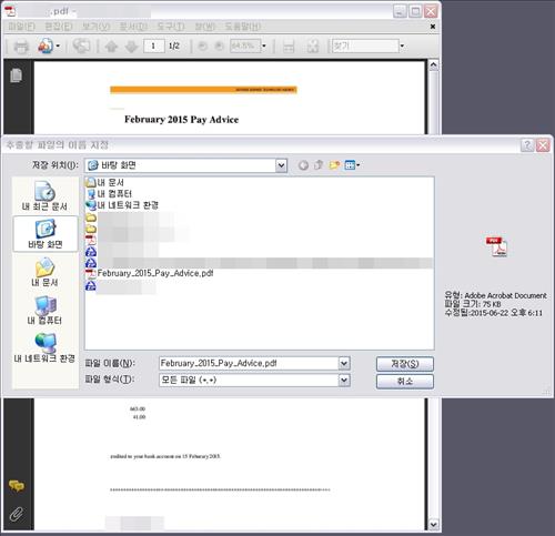 이때 파일을 저장하면 악성 실행파일 생성되고 사용자는 자동으로 악성코드에 감염된다. 저장되는 파일이 PDF 확장자(.pdf)이기 때문에 사용자가 감염 여부를 의심하기 어렵다.