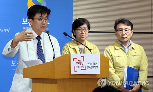 △ '메르스 확진자 및 슈퍼전파자들 특성은' (세종=연합뉴스) 배재만 기자 = 이재갑 한림대병원 감염내과 교수가 23일 오전 정부세종청사 보건복지부 공용브리핑룸에서 열린 중앙메르스대책본부 정례브리핑에서 중동호흡기증후군(메르스) 확진자들에 대한 증상의 특성이나 슈퍼전파자들의 특성등에 대한 분석 결과를 밝히고 있다. 오른쪽은 권덕철 총괄반장과 정은경 현장점검반장. 2015.6.23 scoop@yna.co.kr http://blog.yonhapnews.co.kr/f6464