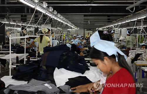 | △ 미얀마 진출 한국 봉제 기업 (양곤=연합뉴스) 현경숙 특파원 = 미얀마 양곤 경제개발구 내 한국봉제기업 '골든샤인' 공장. 미얀마가 지난 2011년 민주화 개혁과 경제 개방을 시작하고 나서 미얀마 진출을 모색하는 한국 기업들이 줄을 잇고 있다. 한국 기업들은 미얀마에서 봉제업에 가장 많이 진출해 있다. 2015.2.18 ksh@yna.co.kr |