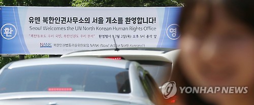 | △ 유엔 북한인권사무소 개소 D-2 (서울=연합뉴스) 김도훈 기자 = 유엔 북한인권사무소 서울 개소를 이틀 앞둔 21일 오전 서울 보신각 사거리에 설치된 사무소 개소 환영 현수막 앞으로 시민이 지나고 있다. superdoo82@yna.co.kr |