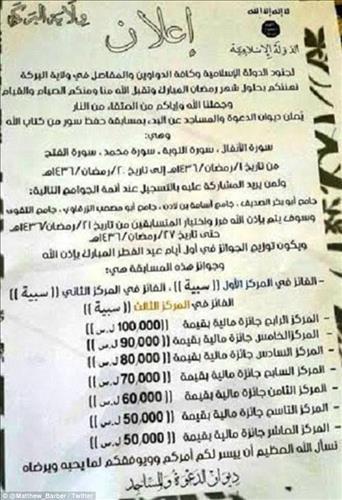 무엇보다 충격적인 내용은 1∼3위 입상자에게 여성 성노예를 상으로 준다는 것이다. IS는 이라크 야지디 족 등 소수민족 여성 수천명을 납치, 성범죄를 저지르는 것은 물론 성노예로 삼는 야만성을 드러내 비난을 받고 있다.