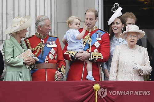 △ Britain's Prince William holds his son Prince George, with Queen Elizabeth II, right, Kate, Duchess of Cambridge, the Prince of Wales and the Duchess of Cornwall during the Trooping The Colour parade at Buckingham Palace, in London, Saturday, June 13, 2015. Hundreds of soldiers in ceremonial dress have marched in London in the annual Trooping the Color parade to mark the official birthday of Queen Elizabeth II. The Trooping the Color tradition originates from preparations for battle, when flags were carried or "trooped" down the rank for soldiers to see. (AP Photo/Tim Ireland)