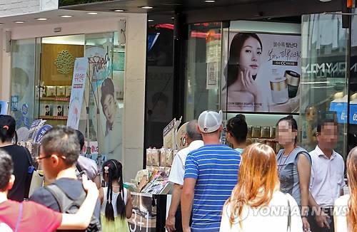 | △ 서울 중구 명동의 화장품 판매점 앞을 사람들이 지나고 있다. 2014.7.7 <연합뉴스 자료사진> |