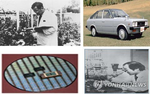 | △ 광복 70년 과학기술 70선…'포니·우장춘 배추·D램 반도체…' (서울=연합뉴스) 미래창조과학부는 광복 70주년을 맞이해 광복 이후 국가경제의 발전을 이끌어온 과학기술 분야의 대표 성과 70선을 선정했다고 24일 밝혔다. 70선에는 우장춘 박사가 잡종 교배로 만든 배추 품종과 국내 첫 독자 모델 자동차인 포니(현대자동차), 한탄바이러스 백신, D램 메모리 반도체 등이 들어갔다. 사진 왼쪽 위 부터 시계방향으로 60년대 일대 잡종 배추 품종을 개발한 우장춘 박사, 70년대 한국 고유모델 국산차인 포니, 80년대 한탄바이러스 백신을 개발한 이호왕 박사, 80년대 D램 메모리 반도체. (미래창조과학부 제공) |