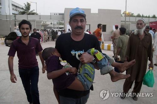 | △ 23일 파키스탄 카라치의 한 병원에서 한 남성이 열사병에 쓰러진 어린이를 안고 가고 있다.(AP=연합뉴스) |