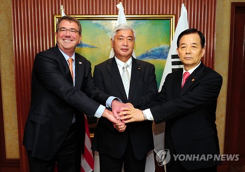 | △ 한국과 일본이 지난 22일(현지시간) 국교정상화 50주년 기념행사를 계기로 관계개선 움직임을 보이는 가운데 군사정보 공유를 본격 시작한 것으로 24일(현지시간) 확인됐다. 사진은 지난 5월 싱가포르에서 열린 제14차 아시아안보회의(샹그릴라 대화)에 참석한 한민구 국방부 장관(오른쪽)이 애슈턴 카터 미국 국방장관(왼쪽), 나카타니 겐(中谷元) 일본 방위상과 회담에 앞서 악수하고 있는 모습. |